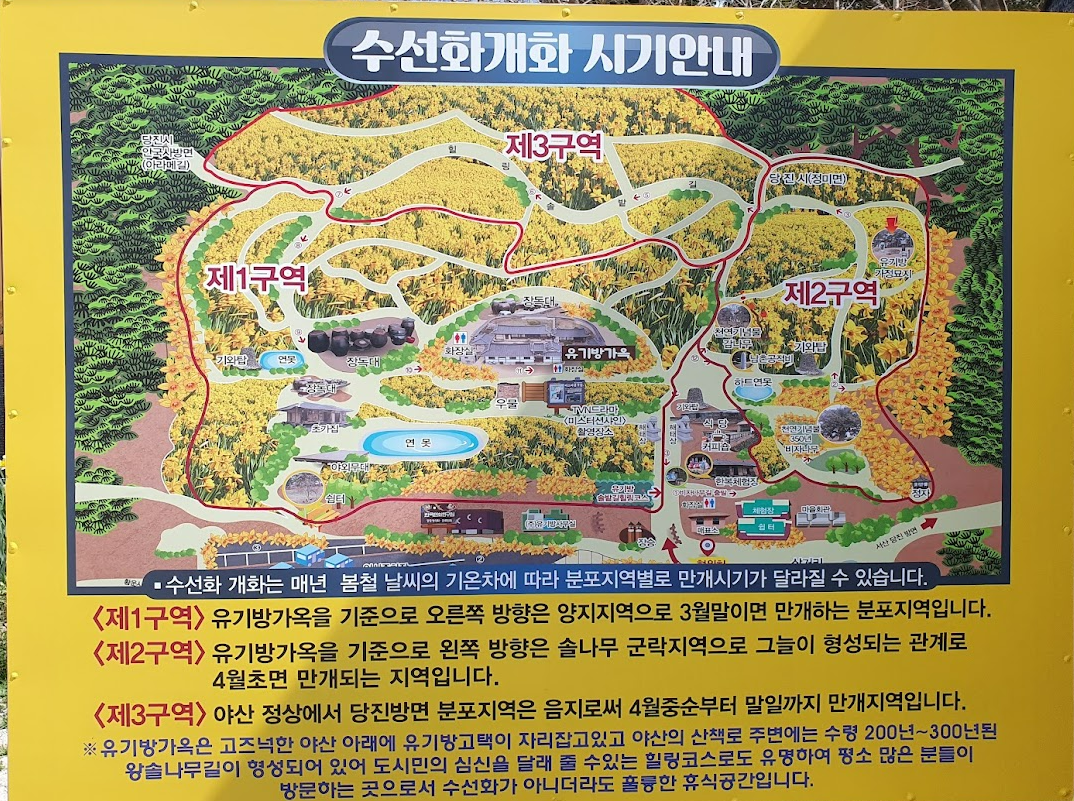 꽃보는 것 말고는 딱히 즐길거리도 없고... 수선화만 있어서 좀 단조롭게 느껴질 수 있습니다. 일찍 가서 얼른 보고 다른데 구경가는 길에 경유지 정도로 하면 될듯합니다.