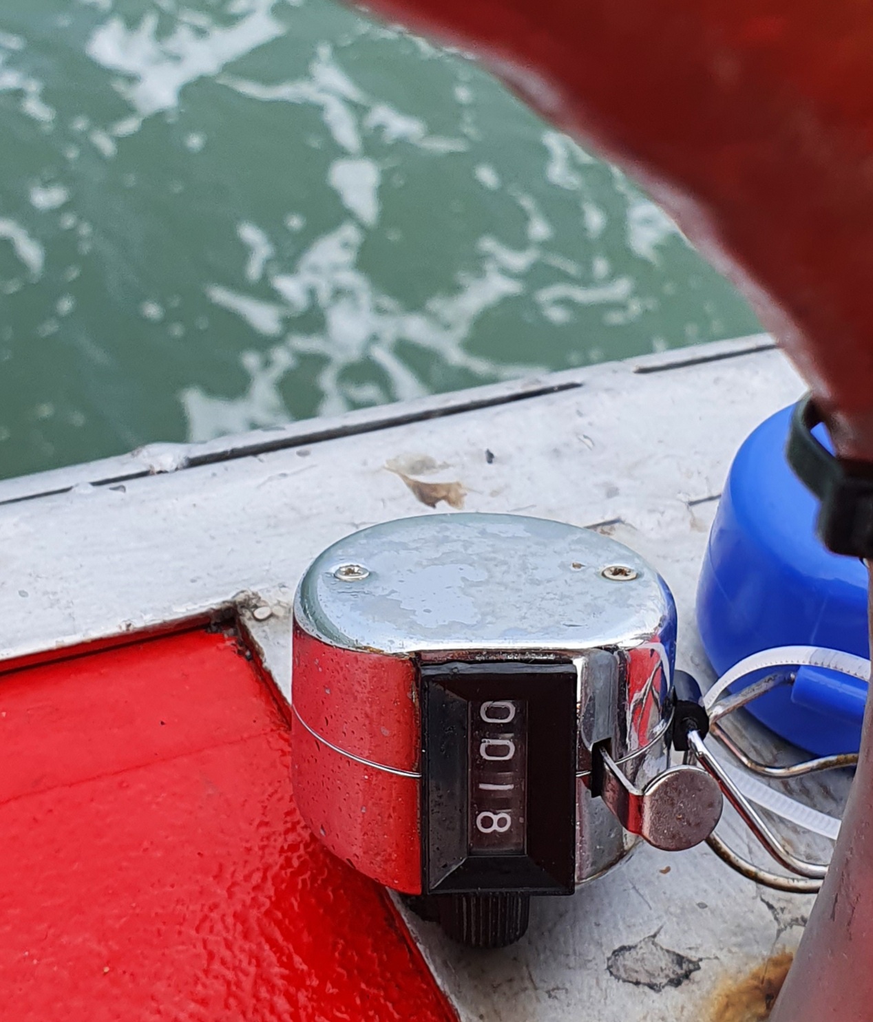 당일날 아침, 배로 바로 집합도착해서 보니 사무장으로 보이는 여자분이 출조자 명단을 작성하도록 하고 있었다. 그래서 명단 작성하면서 "좌현에 자리가 비는것 같은데 좀 옮겨도 될까요?" 하고 물었다. 그랬더니 "안되요 빈자리 없어요" 하는 거다. 나는 '어제 밤에 분명 남은자리가 있었는데 그사이 빈자리가 꽉찼나?' 하는 생각에 내자리로 가서 출항을 기다리는데... "다 작성하셨죠 ?" 하는 사무장님의 확인과 출발한다는 얘기가 났을때... 테이블위에 있는 출조자 명단을 보니 13명정도가 있었다. 나는 '꽉 차있는건 아니군' 하고 생각하는데 선장님의 환영 인사를 하고 출발한다. 보통 얼마정도 간다는 얘기를 하는데 그런얘긴 없다... 그냥 출발 30분넘게 달렸을까 배가 멈추고 "삐소리 나기 전에" 선미 쪽에 기계 소리가 많이 시끄럽다. (나중에 보니 빨간색 풍닻? 오르내리는 소리인데. 올해 이런 풍닻 있는 여러 배를 탔어도 이렇게 시끄러운건 처음이었다.)