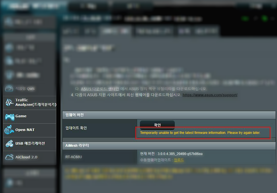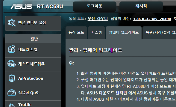 그래서 고민고민 하다가 ASUS 홈페이지에서 수동으로 최신 펌웨어를 다운로드 받아서 공유기로 업로드 해버렸다.