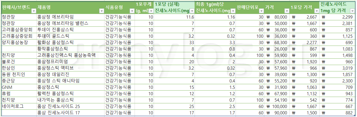 위에서 중요한것은 결국 1포에 들어있는 진세노사이드 함량이다. 보통 1일 1포를 권장하기때문에 이것이 곧 1일 섭취량이 될테니까. 그런데.. 이게 가성비를 보려면 결국 1포 가격보다. 진세노사이드 1mg 당 가격이 얼마인지가 더중요하겠다. 여기에 1포당 가격을 적당한것을 찾으면 되는것이다.