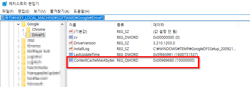 이때 캐시 공간을 정해 주려면 레지스트리 편집기에서 아래와 같이 "ContentCacheMaxKbytes" QWORD 형태로 추가한뒤 kb 단위 x 숫자로 입력을 해주면 됩니다.